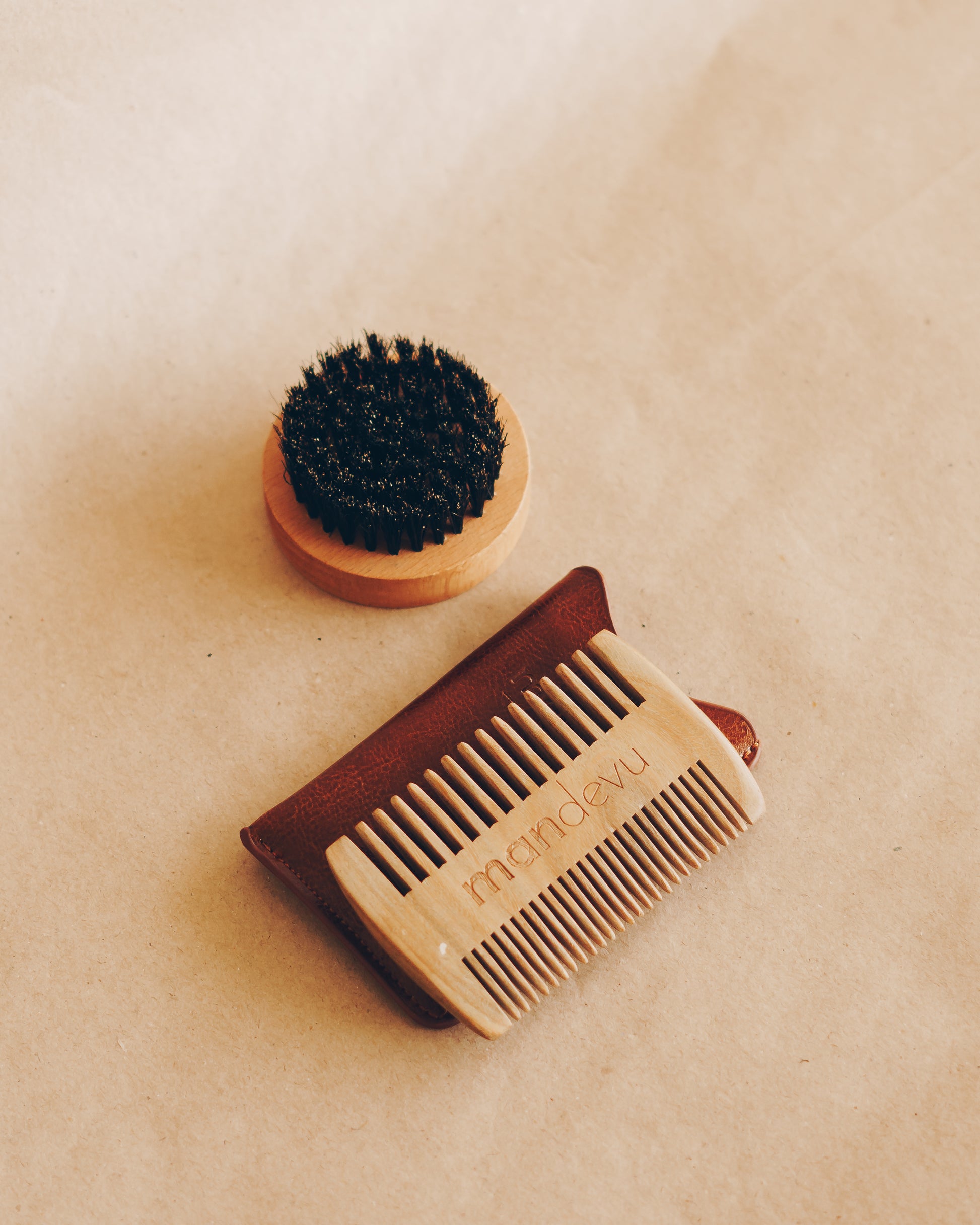 Elevate your grooming game with the MANDEVU STYLING DUO. This dynamic duo includes a beard comb and brush for precise and effortless styling. The comb helps distribute oils for a healthier and smoother beard, while the brush untangles and adds volume. Expertly crafted for a well-groomed appearance.
